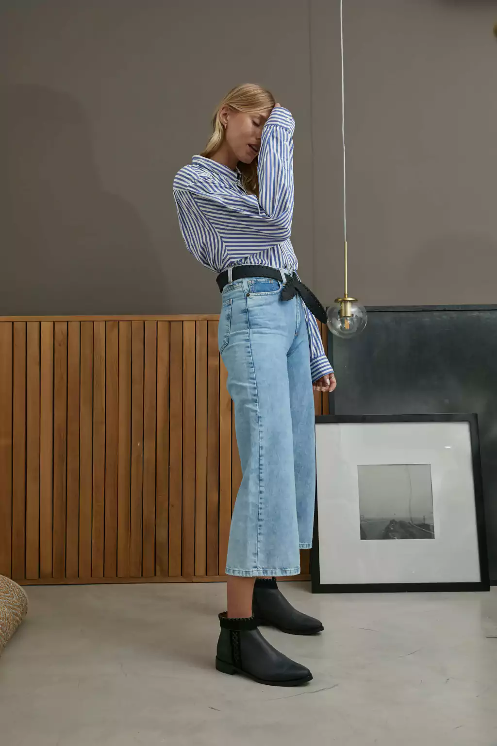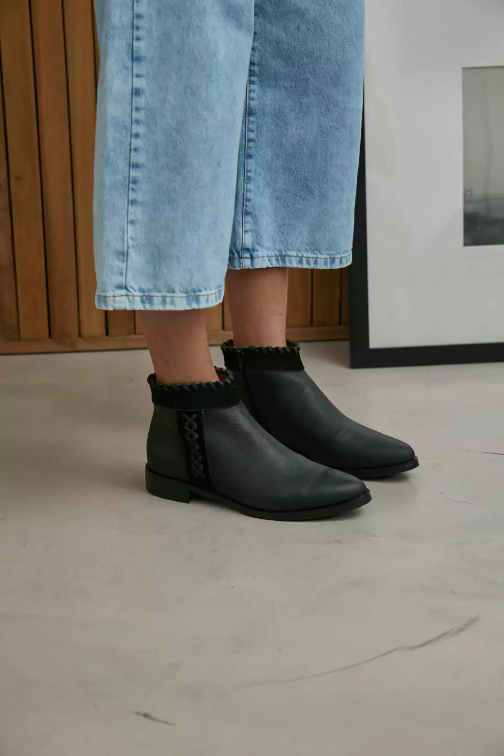 Botineta de cuero forrado integramente en cuero vacuno, con cierre lateral. Detalle de trabajo artesanal con cuero al tono.