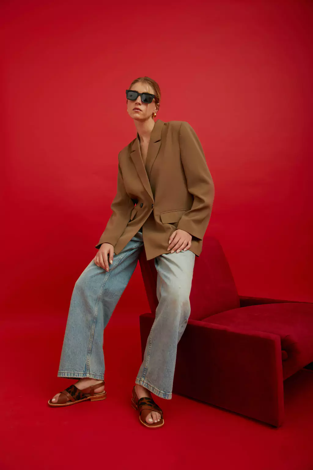 sandalia de cuero con dos tiras en capellada, combinadas en cuero y pelo leopardo. Forrada en cuero vacuno.