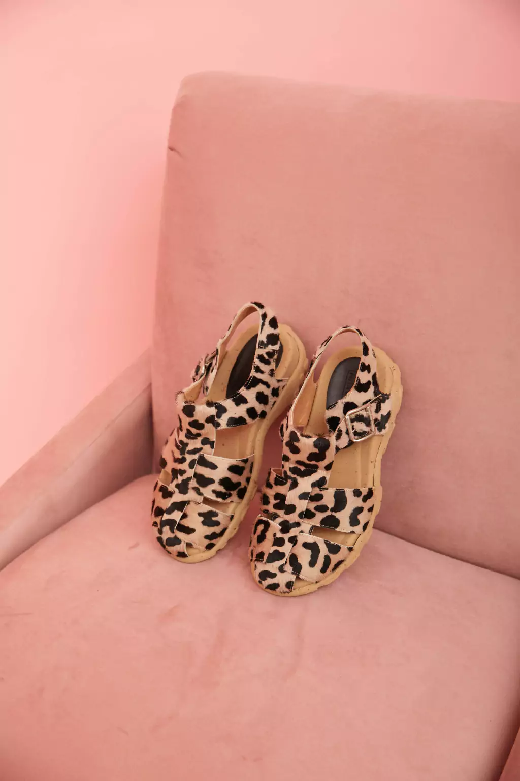 sandalia tipo franciscana confeccionada en pelo leopardo, forrada en cuero vacuno.