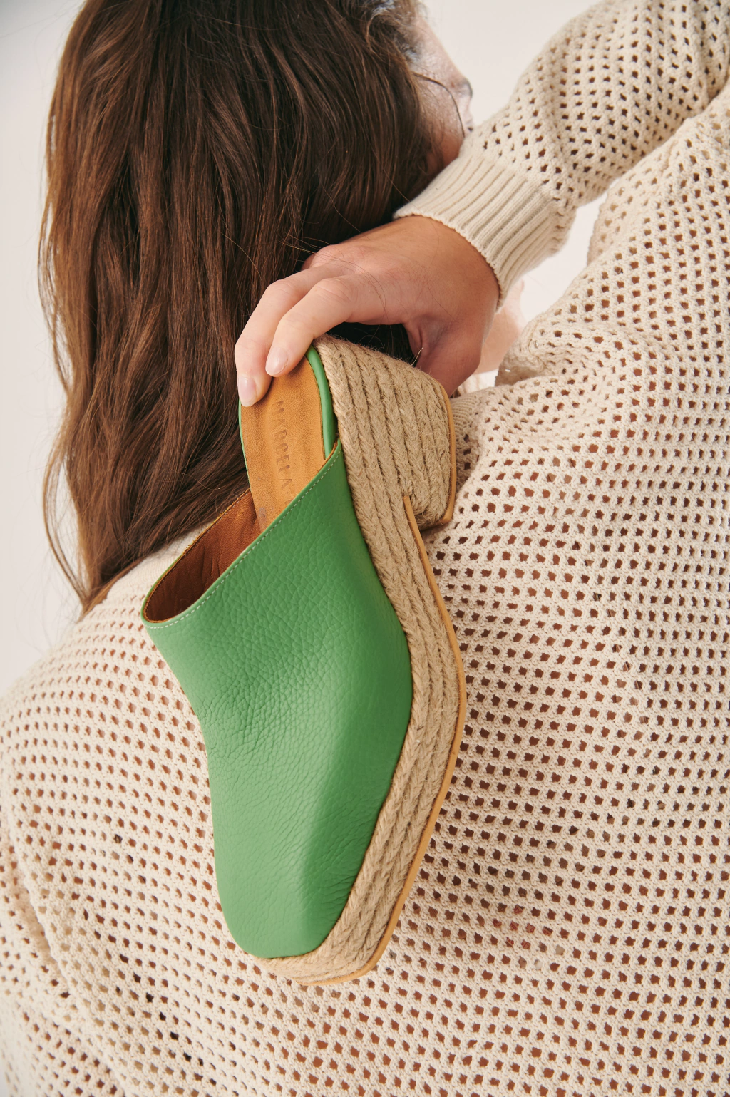 zueco de cuero vacuno con punta cuadrada, base de madera artesanal, liviana, forrada con yute.